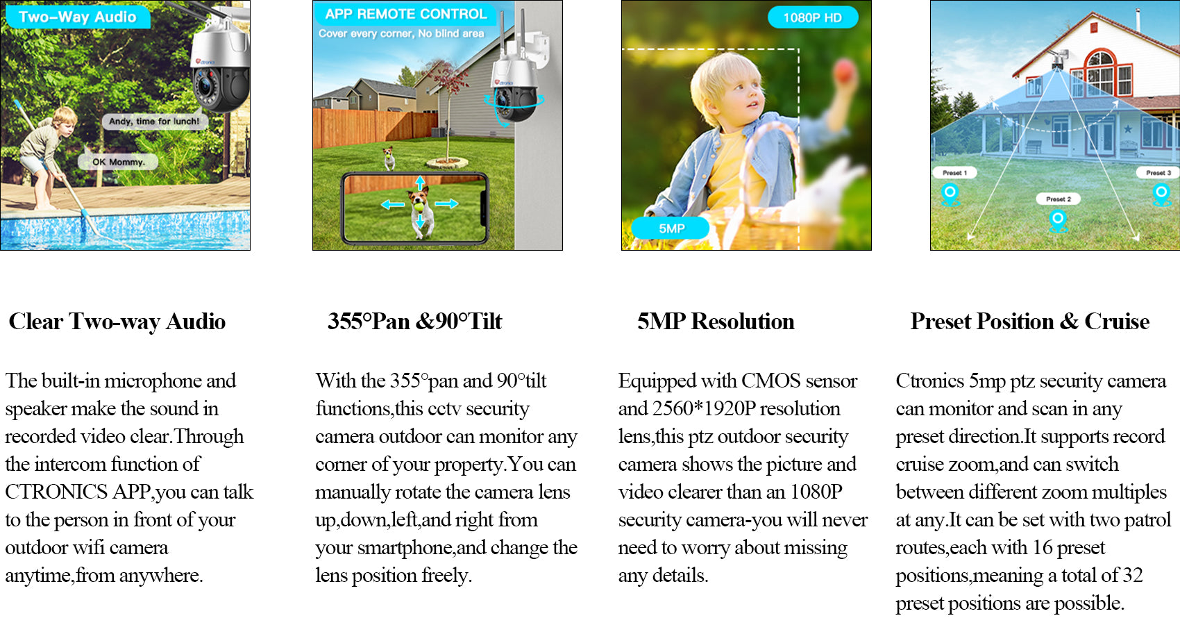 The Ctronics wifi security camera is equipped with a 2560*1920 5-megapixel high-definition lens, which provides more stable videos and clearer images. This 5mp outdoor security camera also supports up to 30X optical zoom. You can zoom in or zoom out as you want, capturing every detail. It is an excellent choice for outdoor safety.