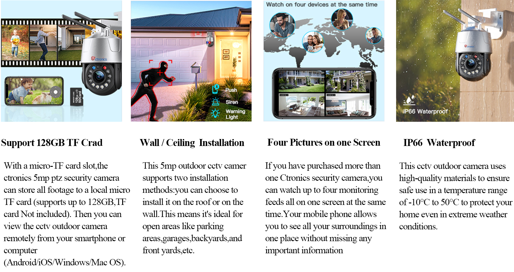 When someone breaks into your garden or house, the outdoor wifi security camera will immediately detect humans, start tracking automatically, and a real-time alarm notification will be sent to your smartphone. At the same time, a flashing red and blue light and alarm sound will frighten the intruder. In addition, Ctronics 5mp outdoor security cameras support custom alarm voice recording.